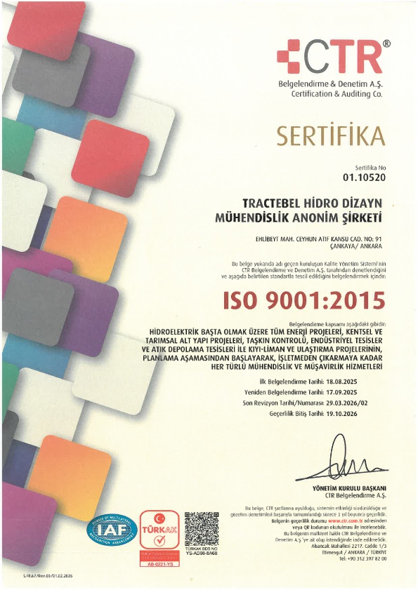 • Tractebel Hidro Dizayn ISO 9001 Kalite Yönetim Sistemi ile uyumlu çalışmaktadır.